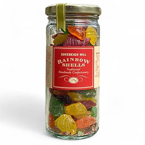 Our Rainbow Shells have a variety of delightful flavours all in one jar.Our famous boiled sweets are hand-made to a traditional recipe at Brown's Confectionery Factory, Sovereign Hill.